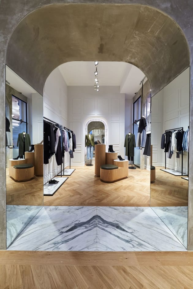 The 75SQM space features European oak, marble accents, waxed white walls and french panelling throughout the three room store.