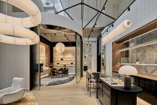 The first floor includes a library-inspired lounge area, as well as private VIP rooms around an interactive writing desk designed by Montblanc’s artistic director, Marco Tomassetta. The space is framed by fluted glass doors, inspired by ink bottles