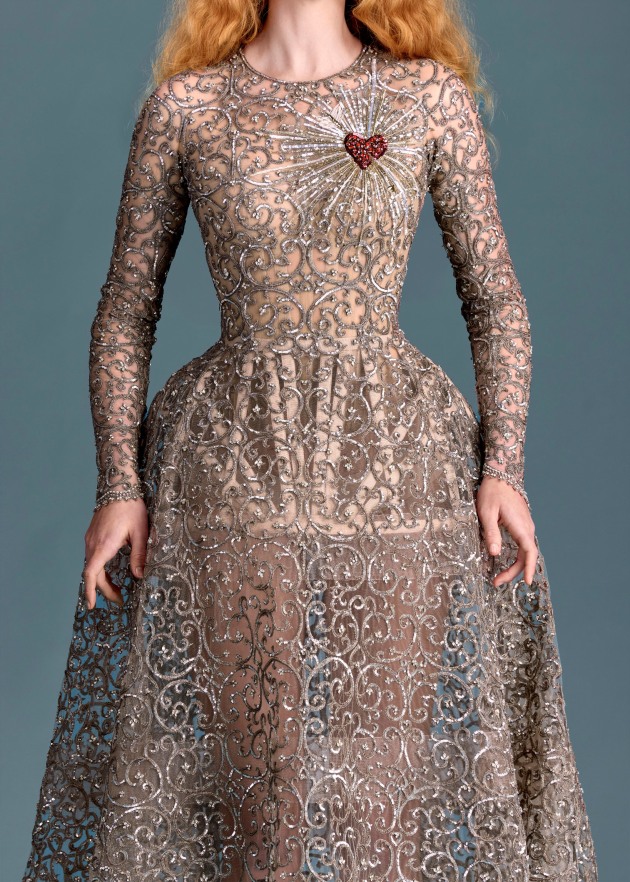 The dress comes from the Adelaide designer label’s 2024-25 autumn/winter collection titled ‘A Lover’s Kiss’. It is an exposed corset cage gown with hand-beaded paillette and crystal work, which includes a bejewelled garnet heart pierced by an arrow. The full range covers 12 styles.