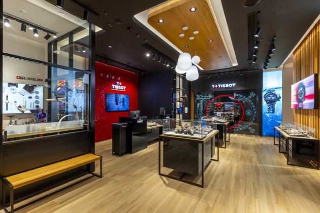 The brand’s signature red accent features prominently throughout the space, alongside digital displays showcasing the brand’s identity. Glass showcases present the collections.