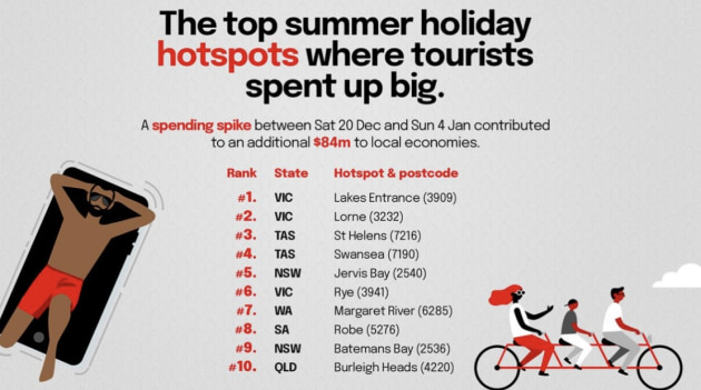 The analysis, based on almost 500,000 merchant terminal transactions, identified Lorne and Lakes Entrance in Victoria, St Helens and Swansea in Tasmania and Jervis Bay in New South Wales as the towns with the biggest overall increase in spending.